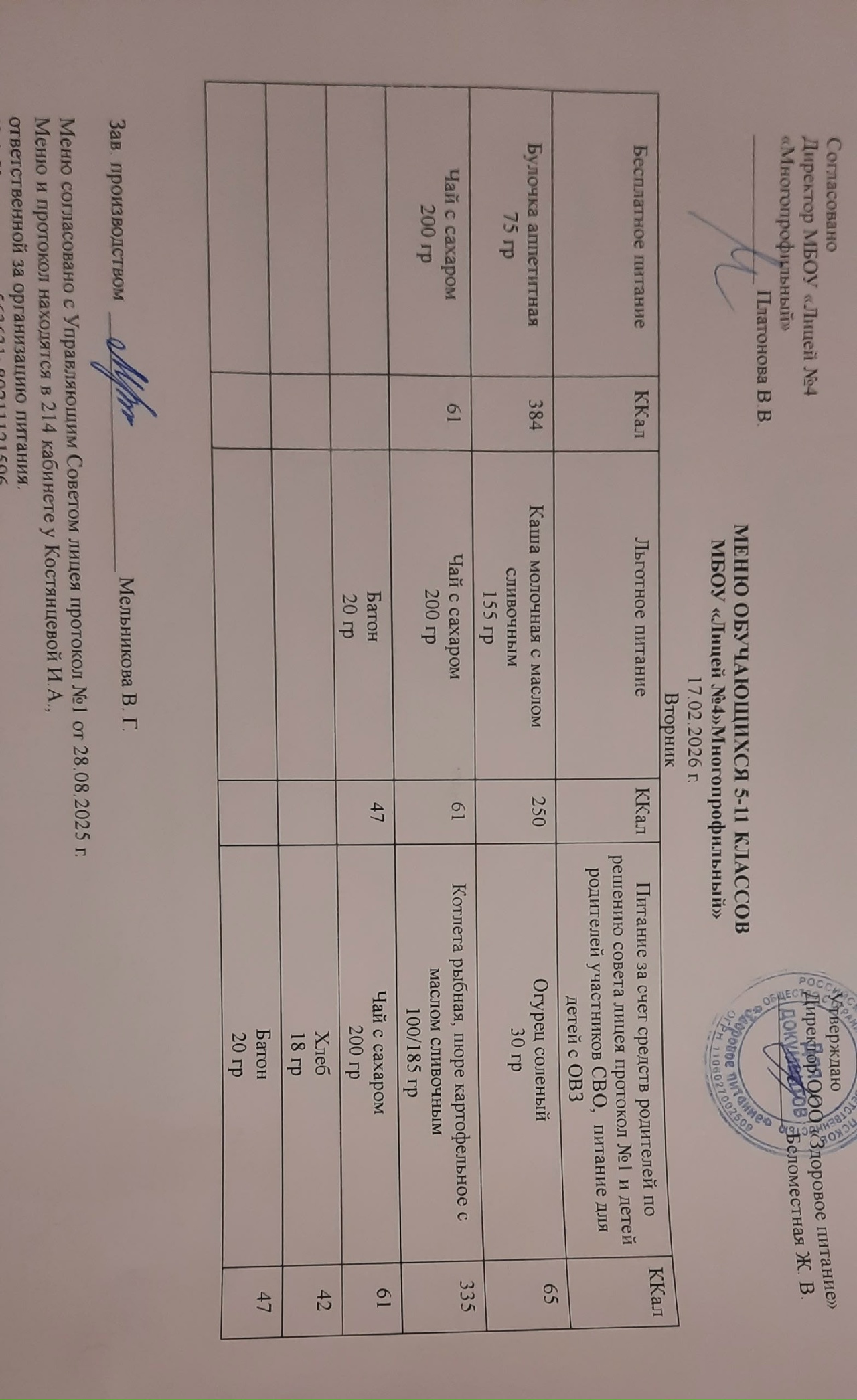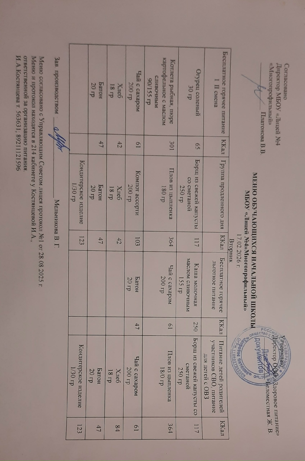 - +7 (8112) 563-631 (Ответственный за организацию питания в лицее - заместитель директора по УВР Костянцева Инна Александровна)