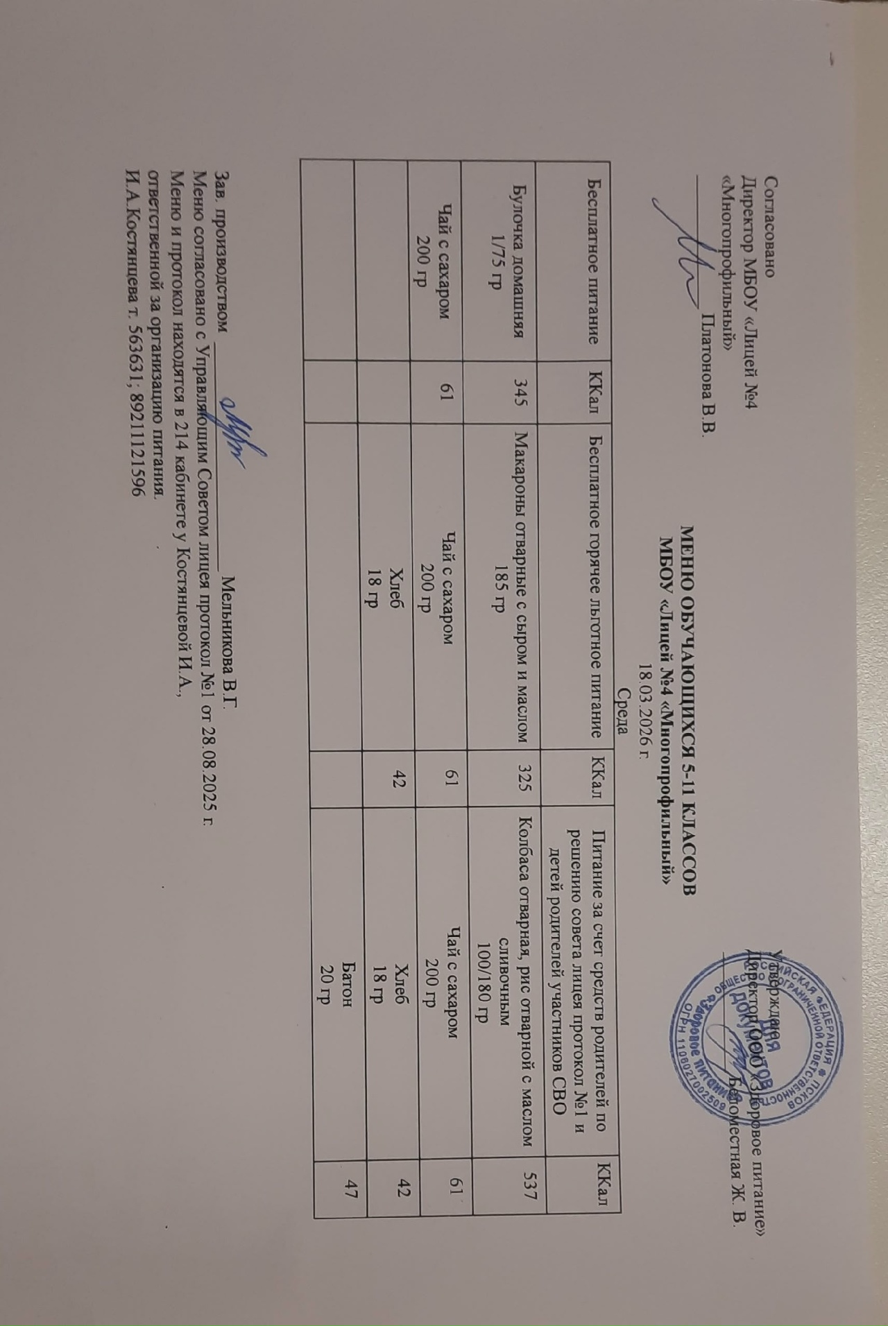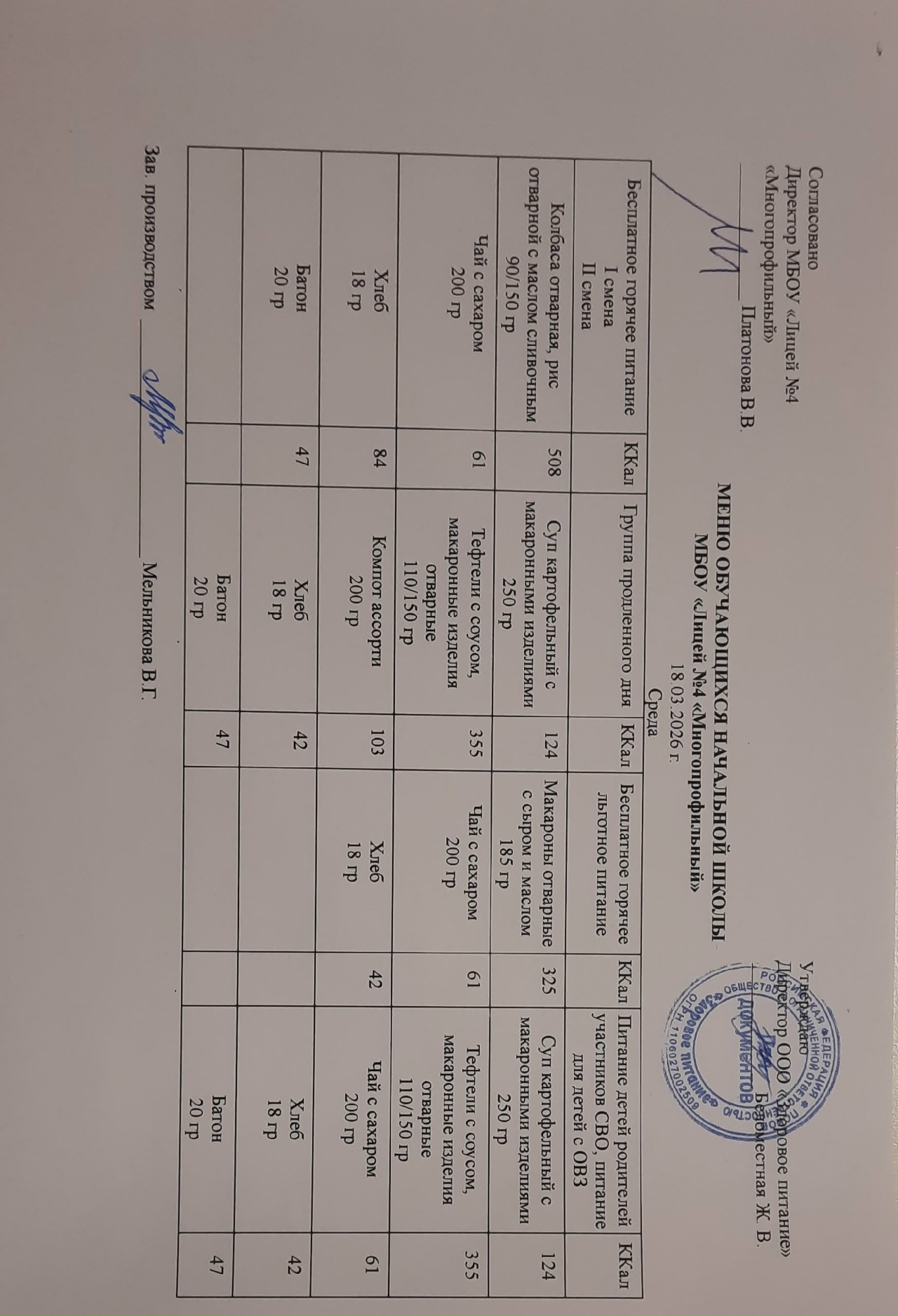 Меню на 18.03.2026 года: