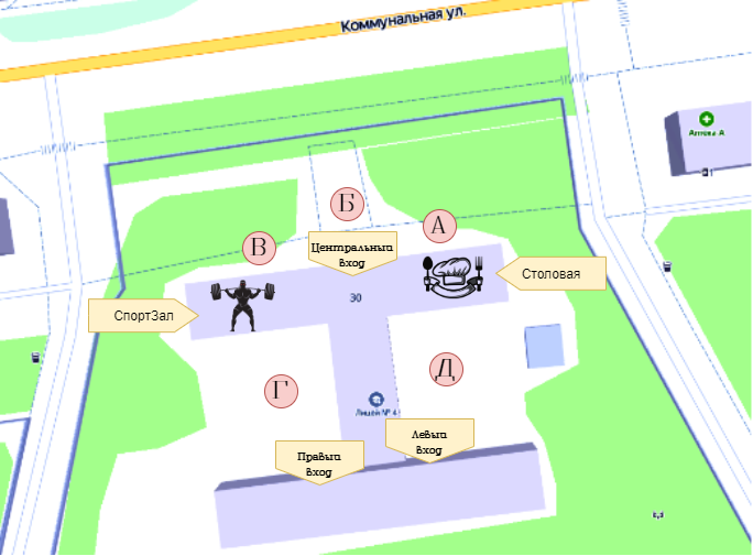 | 2Д | ул. Коммунальная, д.30 (I корпус) левый вход (площадка у столовой) |